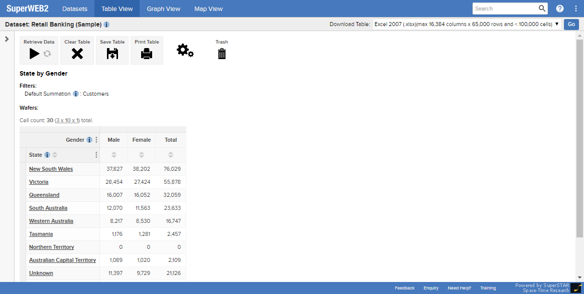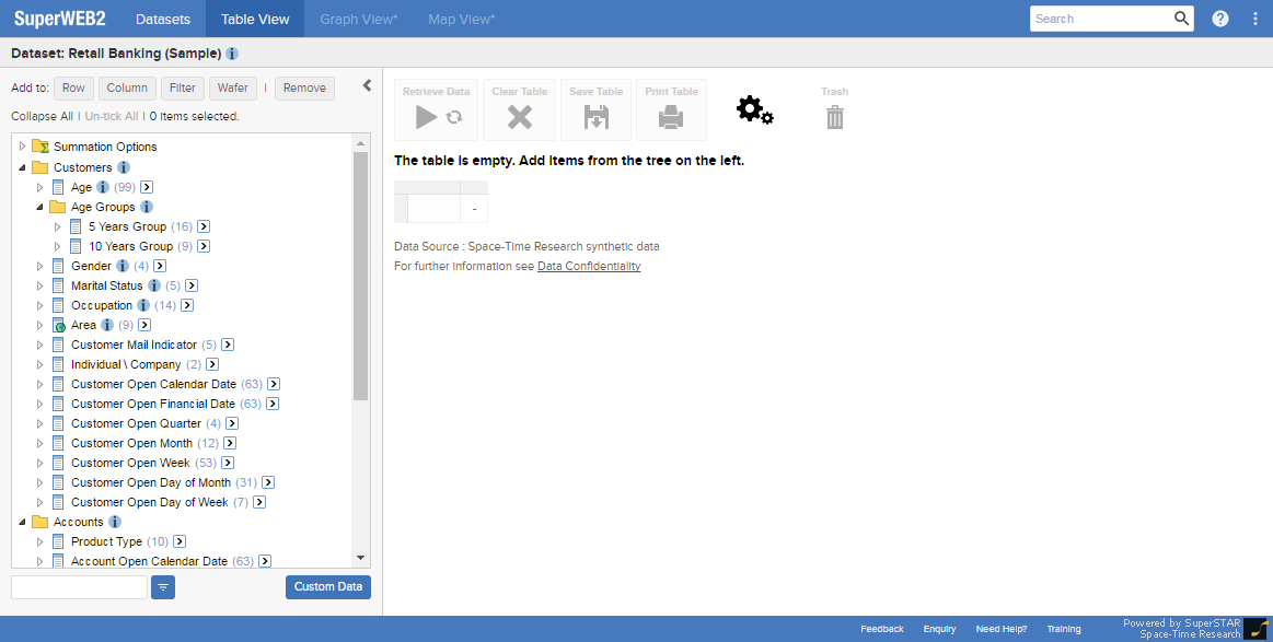SuperWEB2 adds these values to the table:When you add the first field values to the table, SuperWEB2 also adds the default summation, so that your table has something to measure. Typically the default summation will be something like a count. For Retail Banking the default summation option is to count the number of customers.