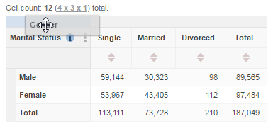 This adds Gender to the column headings. As Marital Status was already in the column headings, it is nested beneath Gender: - Now drag the Marital Status field name onto the rows: