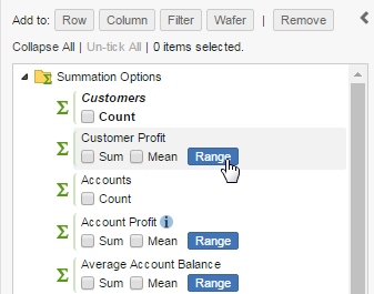 The available summation options are shown at the top of the tree in the customise table panel. Select an option and then click Add to Row, Column, Filter or Wafer to add it to the table.